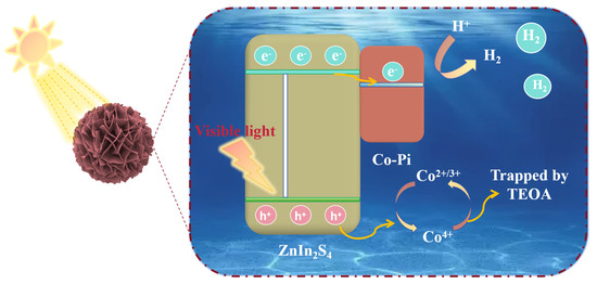 Combined with the above experiments and characterization, we propose a viable mechanism for photocatalytic H2 production of Z5CP under visible light. As shown in Figure 7, under visible light irradiation, Z5CP effectively absorbs the photon energy, and then the electrons on the valence band (VB) are excited and transition to the conduction band (CB), and the corresponding positive electric holes are generated on the valence band (VB). The electron (e−) migrated to the semiconductor surface binds to the H+ adsorbed in water to form H2. However, ZIS has a high electrons and holes recombination rate; therefore, its photocatalytic activity is limited. Notably, Co-Pi has the excellent property of transferring photogenerated holes, and the holes of ZIS are transferred to Co-Pi and drive cycles to catalyze the Co2+/3+ → Co4+→ Co2+/3+ reaction [24]. At the same time, ZIS rapidly exports holes to oxidize the sacrificial reagent of triethanolamine (TEOA); therefore, the resulting photogenerated hole (h+) is effectively separated and consumed by it. Therefore, the photogenerated carrier separation efficiency of the composite photocatalyst Z5CP is improved, which allows more electrons to transfer to the catalyst surface to react with H+ to produce more H2. This is also the main factor for the significant improvement of the photocatalytic H2 evolution performance of Z5CP composite.