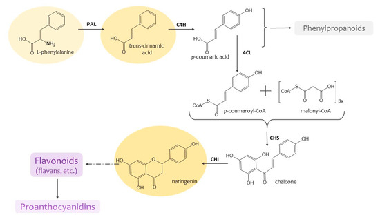 The main stages of phenolic compounds biosynthesis. PAL—L-phenylalanine ammonia-lyase; C4H—cinnamic acid 4-hydroxylase; 4CL—4-coumarate-CoA-ligase; CHS—chalcone synthase; CHI—chalcone isomerase.
