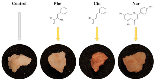 Determination of the total phenolic content in tea callus cultures is an important indicator in assessing their ability to accumulate these secondary metabolites [44,45]. On the example of Cicer arietinum leaves and Sequoia sempervirens callus culture, the increase in its content was shown in the presence of Phe, which was similar to our data [35]. While in the cells of the Moringa oleifera plant this trend was significantly less pronounced, herewith in quinoa sprouts there was no statistically significant difference between the experimental and control variants [30,46]. There are data confirming the increase in the accumulation of PCs in Carthamus tinctorius and Vigna radiata seedlings in the presence of Nar, while in the first case this indicator increased almost two-fold [27,28].