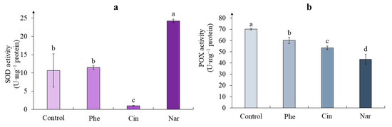 The activity of level of superoxide dismutase—SOD (a), and peroxidase—POX (b), in tea cells cultures grown for 7 days on the liquid Heller culture medium of the basic composition (Control) or enriched with L-phenylalanine (Phe; 3 mM), trans-cinnamic acid (Cin; 1 mM) or naringenin (Nar; 0.5 mM). Results are expressed as means ± SDs, n = 3. The significant differences at p < 0.05 are denoted by different Latin letters.