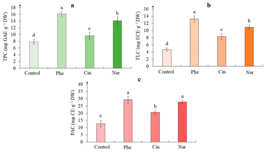 The total phenolic content—TPC (a), the flavanols content—FLC (b), the proanthocyanidins content—PAC (c), in tea cells cultures grown for 7 days on the liquid Heller culture medium of the basic composition (Control) or enriched with L-phenylalanine (Phe; 3 mM), trans-cinnamic acid (Cin; 1 mM) or naringenin (Nar; 0.5 mM). Results are expressed as means ± SDs, n = 3. The significant differences at p < 0.05 are denoted by different Latin letters.