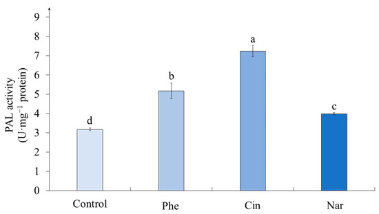 The level of phenylalanine ammonia-lyase (PAL) activity in tea callus cultures grown for 7 days on the liquid Heller culture medium of the basic composition (Control) or enriched with L-phenylalanine (Phe; 3 mM), trans-cinnamic acid (Cin; 1 mM) or naringenin (Nar; 0.5 mM). Results are expressed as means ± SDs, n = 3. The significant differences at p < 0.05 are denoted by different Latin letters.