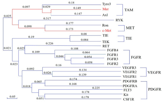 Mer and c-Met, both belonging to the receptor tyrosine kinase family, exhibit similar structures. To assess their relation, an analysis of the amino acid sequence in the kinase-binding region of human protein tyrosine kinases was conducted, resulting in a tree diagram drawn using the N-J method (Figure 3). The types of tyrosine kinases are depicted on the right side of the diagram, and the values on the lines are calculated using the Tamura–Nei method [24,25]. Larger values indicated a higher degree of evolution. Figure 3 highlights that the distance between Mer kinase and c-Met kinase is the closest (marked in red), suggesting a low degree of evolution and a close relation in the basic amino acid sequences within the kinase domain. Additionally, both Mer and c-Met receptors can activate common signaling molecules, and the two receptor families share similar functions. Consequently, concurrently targeting Mer and c-Met receptors is supported by a feasible and solid theoretical foundation.
