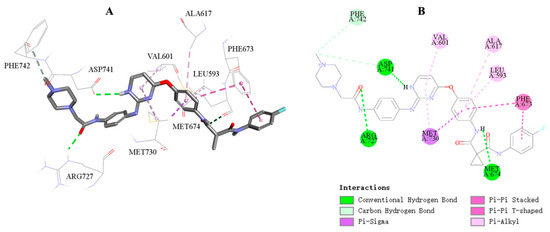 The docking mode of 18c with Mer kinase (PDB: 4M3Q). (A) 3D binding mode and (B) 2D binding mode.