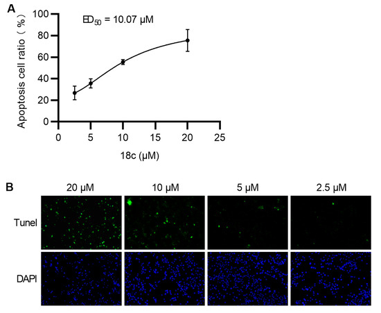 The One Step TUNEL Apoptosis Assay Kit (Meilunbio, Dalian, China) was used for studying apoptosis in a dose-dependent manner. HCT116 cells (1.5 × 104 cells/well) were cultured in TC-treated glass coverslip-containing plates. After 24 h incubation, cells were treated with the indicated various concentrations of compound 18c for 48 h. Next, adhered cells were fixed with 4% paraformaldehyde and permeabilized with 0.3% Triton-X-100. TUNEL staining was performed according to the manufacturer’s instructions. The nuclei of cells were counterstained with the DAPI reagent. Images were taken using an Olympus fluorescence microscope. The ED50 for 18c was calculated with the program GraphPad PRISM 9.5. The assay was performed in triplicate, and each experiment was repeated three times.