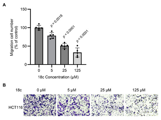 Compound 18c inhibited cell migration in HCT116 cancer cells. (A) Representative images of transwell assay of HCT116 cells treated with compound 18c for 24 h. (B) Quantification of transwell assay.
