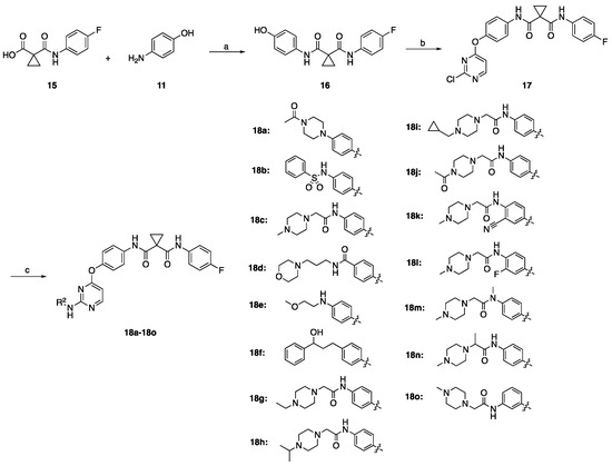 1-((4-fluorophenyl)carbamoyl)cyclopropane-1-carboxylic acid (15) was firstly reacted with 4-aminophenol (11) to obtain intermediate 16 [31] and was treated with 2,4-dichloropyrimidine to yield the key intermediate 17. Finally, 17 was reacted with different substituted anilines to give the desired compounds 18a–18o. The method is shown in Scheme 2.