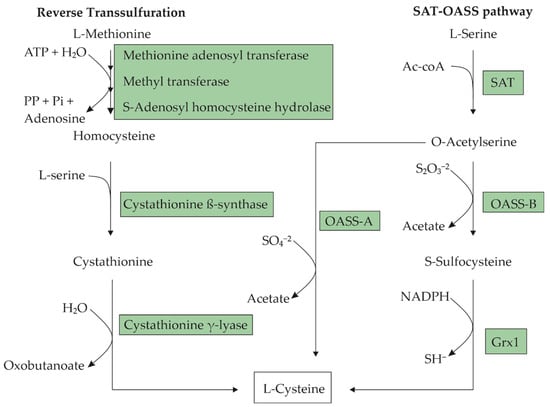 L-cysteine is a nucleophilic amino acid with a sulfhydryl group, which enables the formation of disulfide bridges. It can be produced by most eukaryotic and prokaryotic organisms. This amino acid is semi-essential in humans, since it can be synthesized endogenously or directly absorbed from an L-cysteine-rich diet. In cells, cysteine can be produced via the reverse transsulfuration pathway from L-methionine [1] or from L-serine through acetylation and subsequent sulfhydration [2]. Figure 1 presents a step-by-step diagram for these pathways. The cells tightly control the intracellular L-cysteine concentration because already-low concentrations can be cytotoxic [3,4]. Intracellular L-cysteine plays a vital role as a precursor for protein synthesis, and for the production of glutathione, hydrogen sulfide, and taurine [5]. In humans and animals, L-cysteine is primarily found in the hair, nails, and skin, especially in collagen. Prokaryotic cells use L-cysteine mostly in proteins, in enzymes for the formation of iron–sulfur clusters, or as a source of sulfur for other macromolecules [6].