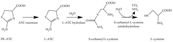 An alternative approach is the biotechnological production of L-cysteine from renewable resources [13]. Since the 1980s, microorganisms of the genus Pseudomonas have been used for the asymmetric whole-cell biocatalysis of DL-2-amino-Δ2-thiazoline-4-carboxylic acid (DL-ATC) to generate L-cysteine (Figure 2).