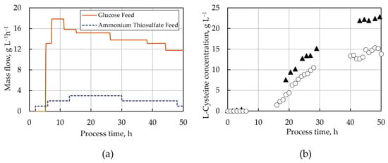 Liu et al. [13] utilized a rational approach which combined previously discussed metabolic engineering approaches to enhance the L-cysteine production of the E. coli strain JM109, including the overexpression of the enzymes in the L-serine biosynthetic pathway, feedback-insensitive phosphoglycerate dehydrogenase and serine acetyltransferase, the ydeD exporter, and the deletion of L-cysteine and serine deaminases. These modifications lead to a total L-cysteine production in shake flasks of 600 mg L−1. They then cultivated this modified strain in a 5 L stirred-tank reactor in a fed-batch operation, where a glucose solution was fed constantly into the reactor, but thiosulfate (the sulfur source) was only supplied at the beginning of the process. This led to an increase in the maximal achieved L-cysteine concentration to 5.1 g L−1.
