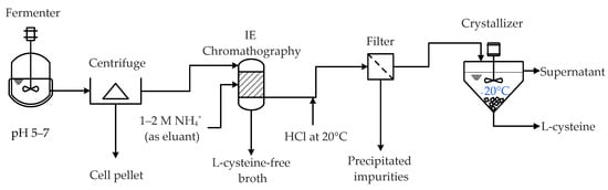The first step in the direct purification process (Figure 4) involves ion exchange chromatography. In this step, L-cysteine, as well as L-cystine and other cations present in the clarified fermentation broth, are adsorbed onto an ion exchanger containing sulfonic and phosphonic acid groups in their protonated (H+) form. The absorbed compounds are subsequently eluted using ammonia solution (1–2 molar NH4+) as the eluant. The use of a gradually increasing ammonia concentration and fractioned separation of the product solution further improves the purity of L-cysteine. It is important to note that although the L-cysteine-containing solution is highly acidic, the chromatography process effectively removes all oxidizing agents, mitigating concerns about the oxidation of L-cysteine [62]. Subsequently, to further purify L-cysteine from the solution, fractioned crystallization is performed as described previously [72]. This method involves the addition of hydrochloric acid at 20 °C to facilitate the crystallization of remaining impurities. The resulting deposits are then removed through filtration, and the filtrate is cooled to −20 °C to induce the crystallization of L-cysteine.