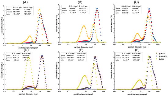 Particle size distribution (PSD) of guava samples. (A) Untreated puree with peel (GWP); (B) Untreated puree without peel (GWOP); (C) GWOP samples treated by HPH; (D) GWOP samples treated by EM; (E) GWOP samples treated by PEF and (F) GWOP samples treated by HHP. ■ puree; ● pomace; ▲ juice. Means with different letters showed significant difference (p < 0.05).