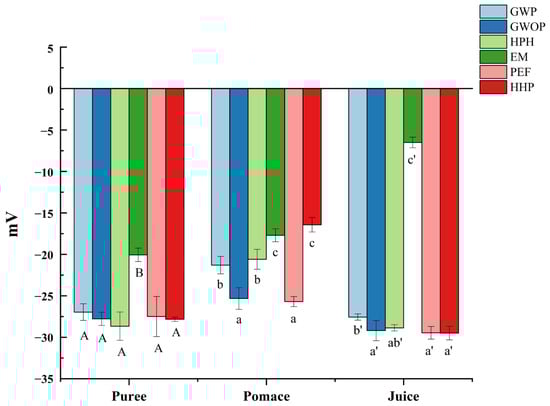 Effect of different treatments on the zeta potential of guava samples. In each component, different letters represent significant differences (p < 0.05).