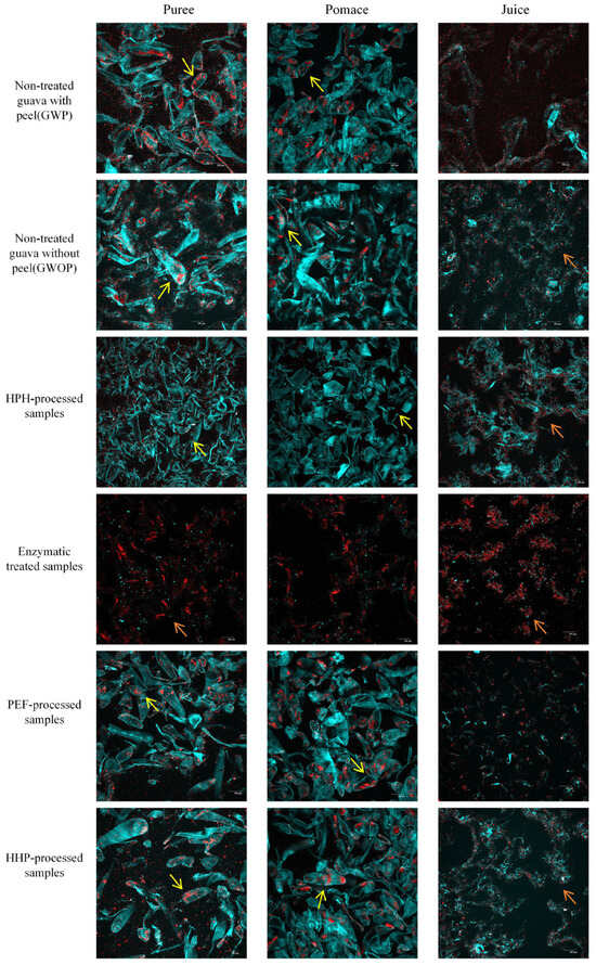 CLSM images of guava samples (puree, pomace, and juice) treated by different processing techniques (yellow arrows point to intact cells, and orange arrows point to discrete carotenoids).