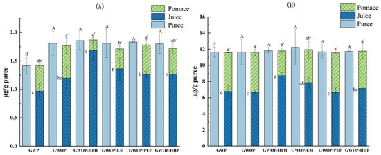 Carotenoid contents of different treated guava samples (the carotenoid contents in juice and pomace were presented per gram of the corresponding purees). (A) β-carotene; (B) lycopene. In each figure, different letters represent significant differences (p < 0.05).