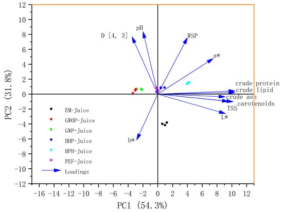PCA is an unsupervised chemometric technique that can be used to reveal the hidden trends in sample clustering. As shown in Figure 6, the first two principal components (PCs) explained 87.6% of the total variance, indicating that these two PCs included most information of quality variation. In this plot, all the parameters, namely carotenoid content, TSS, pH, D [4, 3], WSP, basic components, and CIE values score, were denoted as loadings. Most of the parameters showed positive correlations with PC1, with the basic components, carotenoid content, TSS and L* having a large contribution to PC1. Among all the parameters, only b* showed a negative correlation with both PC1 and PC2. The samples lying close to each other in the bi-plot are often characterized by similar properties. For example, the GWOP-Juice and GWP-Juice points were close, suggesting that the presence of peel did not cause significant changes in juice characteristics. Moreover, all treated sample points shifted in the positive direction of PC1, with HPH-Juice moving the most. On the contrary, in terms of PC2, the EM-Juice showed a significant negative shift, implying that the EM treatment drastically altered the relevant properties of the juice.
