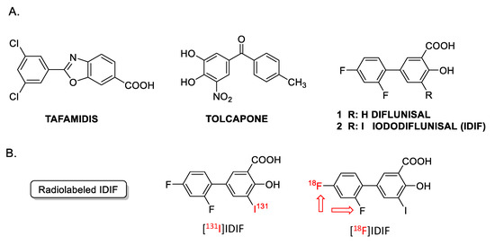 (A) Examples of TTR tetramer stabilizers: tafamidis, tolcapone, diflunisal and iododiflunisal (IDIF); (B) chemical structure of radiolabeled derivatives of IDIF. The [18F]IDIF synthesis has been tackled in this work. (Note: The red arrows indicate that both fluorine atoms can be radiolabeled).