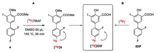 Firstly, the 18F-radiofluorination was investigated with the crude reaction mixture being analyzed by high performance liquid chromatography (HPLC) coupled to a radioactive detector (radio-HPLC) to monitor the formation of the desired labeled compound and determine radiochemical conversion (RCC) values. When compound 4 (5 mM and 55 mM) was reacted with [18F]TBAF (produced as reported previously [38]) in DMSO or N-methyl-2-pyrrolidone (NMP) as the solvent at 140 °C (Figure 2A), the desired 18F-labeled product was not observed (see Supplementary Materials, Figure S13). When the temperature was increased to 180 °C for 30 min in NMP (concentration of 4 = 55 mM), multiple radiofluorinated products were formed along with [18F]4, as confirmed by radio-HPLC (see Supplementary Materials, Figure S14). Still, the low radiochemical conversion, as well as the need for purification and subsequent hydrolysis to reach [18F]IDIF, may lead to very low radiochemical yields. Hence, this route was abandoned.