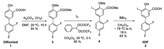 Synthesis of iododiflunisal (2): For a solution of compound 4 (70 mg, 0.17 mmol, 1.0 eq.) in DCM (2 mL), BBr3 (0.16 mL in 1 M solution in CH2Cl2) was added at −78 °C under nitrogen atmosphere. The reaction mixture was stirred at −78 °C for 15 min. Then, the reaction mixture was stirred at room temperature under nitrogen for 18 h. The reaction was quenched with a saturated sodium bicarbonate solution (10 mL; final pH = 9–10) and DCM was evaporated. Non-polar impurities were extracted with hexane (3 × 20 mL). The desired compound was extracted with DCM (3 × 20 mL), and the combined organic layers were washed with brine (1 × 10 mL), dried over MgSO4, and concentrated under vacuum to yield compound 2 as a white solid (54 mg, isolated yield: 83%). TLC (10% MeOH in dichloromethane). 1H NMR (400 MHz, DMSO-d6, 23 °C, δ): δ 7.82 (t, 1H), 7.76 (t, 1H), 7.49 (q, 1H), 7.26 (t, 1H), 7.11 (t, 1H); 13C NMR (100 MHz, DMSO-d6, 23 °C, δ): δ 172.5, 170.8, 164.1, 140.9, 131.7, 130.8, 124.5, 123.4, 119.6, 112.5, 112.2, 104.5, 87.6; 19F NMR (400 MHz, DMSO-d6, 23 °C, δ): –δ −112.4, −114.1. HRMS: (m/z) calculated for C13H8O3F2I (M+H+): 376.9408; Found: 376.94793, in accordance with our published data [29,39]. Furthermore, IDIF (2) was prepared in three synthetic steps with 66% overall yield.