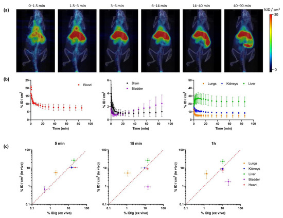 Quantification of the images (Figure 4b) confirmed that the labeled IDIF rapidly accumulated in the liver, with values of 27.5 ± 7.2% ID/g at ca. 7 min after administration, with a progressive decrease afterwards to reach a plateau at ca. 25% ID/g. The concentration of radioactivity in the volume of interest (VOI) drawn at the heart, which can be considered a surrogate of the concentration of radioactivity in the blood, confirms long circulation time. The presence of radioactivity in the kidneys and a progressive increase in the bladder confirm partial elimination via urine. The presence of radioactivity could also be detected in the lungs (12.6 ± 2.1% ID/g immediately after the start of image acquisition to reach a plateau at ca. 5% ID/g) and the brain (ca. 1%ID/g a t > 10 min after administration). However, these are highly irrigated organs, and these values could be overestimated because of the high concentration of radioactivity in blood.