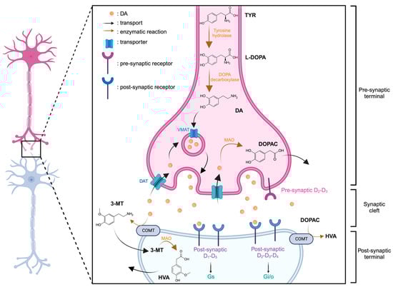 Representation of dopaminergic synapse. Created with BioRender.com accessed on 15 January 2024.