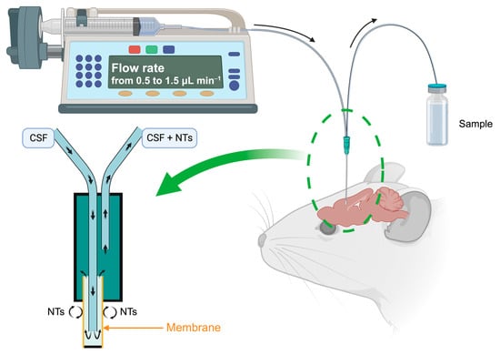 Schematic principle of the microdialysis on a brain mouse. Created with BioRender.com accessed on 15 January 2024.