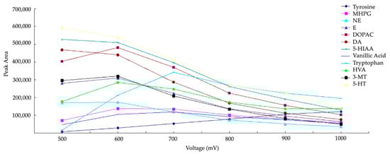 ECD has also been extensively utilized for the detection and quantification of NTs and their metabolites [43,44,45,46]. It proves to be a straightforward and sensitive method for quantifying small amounts of NTs. One of its notable benefits is its simplicity and minimal maintenance.