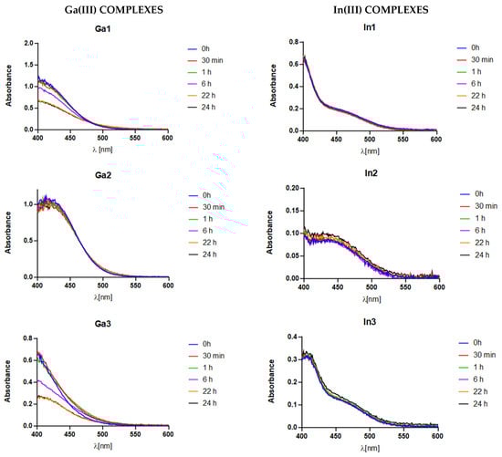 All the solutions showed to be overall stable along a 24 h interval (see Figure 5). The absorbance values were slightly lower in certain cases due to a minimal precipitation of the compounds, but most of all no qualitative changes are reported. This indicates that the complexes are stable, therefore, no metal ions were released in the solution. This informs about the strong affinity between these metals and ligands in an in vivo like environment.