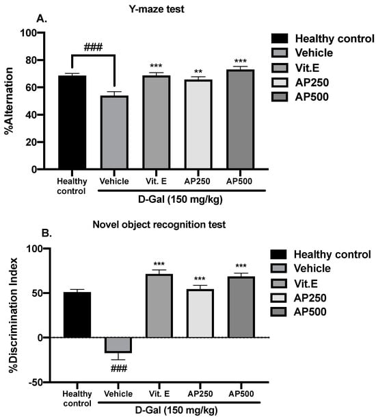 Several behavioral models were used to evaluate D-Gal-induced cognitive dysfunction in the mice. Spatial working memory performance was assessed using the Y-maze task and the novel object recognition test (NORT). The percentage of the spontaneous alternation of the Y-maze test is shown in Figure 2A. The D-Gal vehicle-treated group showed significantly deteriorated cognitive abilities as a reduced percentage of alternation compared with the healthy control group (p < 0.001). Treatment with vitamin E (100 µg/kg/day) and AP (250 and 500 mg/kg/day) restored the percentage of spontaneous alternation in D-Gal-treated mice to the level seen in the healthy control group. For the NORT (Figure 2B), the healthy control group spent significantly more time exploring the novel object than the familiar one, while the vehicle-treated mice failed to discriminate between these two objects, indicating that D-Gal impaired object recognition. On the other hand, the D-Gal-treated mice showed a significantly improved discrimination performance in the test phase after administration of vitamin E (100 µg/kg/day) and AP (250 and 500 mg/kg/day) for 8 weeks (for detailed statistical analysis, see Tables S2 and S3).