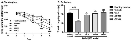 Latency time of training the mice to find the target platform (n = 10). Each data point represents the mean ± SEM of latency, four trials/day for five days (A). The effect of AP on the D-Gal-induced cognitive deficit in the MWMT (B). Each column represents the mean ± SEM (n = 10). ### p < 0.001 vs. the healthy control group; * p < 0.05 and *** p < 0.001 vs. the vehicle-treated group; and $ p < 0.05 and $$ p < 0.01 vs. AP (post hoc Tukey test).