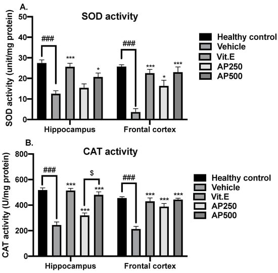 The effect of AP on antioxidant enzymes in the hippocampus and frontal cortex (n = 6). Each data point represents the mean ± SEM. The SOD and CAT activities are presented in panels (A,B), respectively. ### p < 0.001 vs. the healthy control group; * p < 0.05 and *** p < 0.001 vs. the vehicle-treated group; and $ p < 0.05 vs. AP (post hoc Tukey test).
