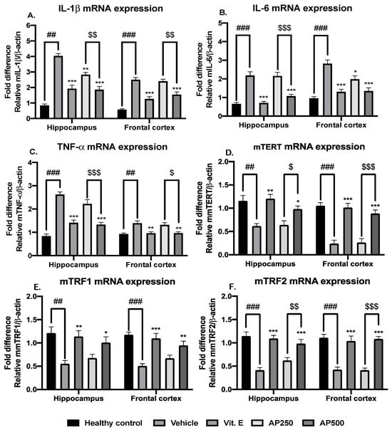 Anti-inflammatory effects and alleviating effects of AP on aging. Each data point represents the mean ± SEM. For the interpretation of the inflammatory pathway, the results are shown in panels (A–C). The telomere-attrition-relating process is indicated in panels (D–F). ## p < 0.01 and ### p < 0.001 vs. the healthy control group; * p < 0.05, ** p < 0.01, and *** p < 0.001 vs. the vehicle-treated group; and $ p < 0.05, $$ p < 0.01, and $$$ p < 0.001 vs. the AP-treated group (post hoc Tukey test).