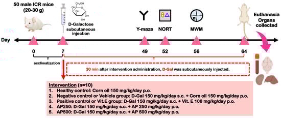 The healthy control group was orally administered with corn oil 150 mg/kg/day once daily for 8 weeks. Treatment groups were orally administered with vitamin E (Sigma Aldrich, St. Louis, MO, USA) and AP 30 min prior to subcutaneous administration with D-Gal (Sigma-Aldrich, St. Louis, MO, USA), as illustrated in Figure 6.