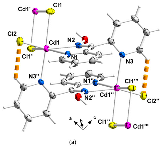 For reasons outlined in the Introduction section, we sought the preparation of Cd(II)/dpkoxH complexes. The best results (from the crystallization viewpoint) were obtained using cadmium(II) halides. We started our efforts using neutral dpkoxH, i.e., by avoiding adding an external base in the reaction mixtures, which would lead to the deprotonation of the oxime group. Reactions with the addition of bases are in progress in our laboratories, and—if successful—they will be submitted in the future. A variety of CdX2/dpkoxH (X = Cl, Br, and I) reaction systems using different reagent molar ratios, solvent media, temperatures, and crystallization techniques were systematically employed before arriving at the optimized preparative conditions described in Section 3. Equations (1)–(3) illustrate the synthesis of the complexes.