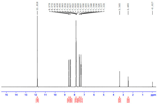 In an attempt to probe the solution behavior of 1∙2H2O, 2, and 3, the NMR spectra (1H, 13C, 113Cd) of the complexes in d6-DMSO were recorded at room temperature. The 1H and 13C NMR spectra of the three complexes are identical; however, the most remarkable feature is that the three spectra are also identical to the spectrum of free dpkoxH in the same solvent. This is evidence that the three complexes decompose in d6-DMSO, releasing dpkoxH, a fact attributable to the strong donor capacity of the solvent. The spectra show a singlet signal at δ 11.82 ppm assigned to the hydroxyl proton [16,30,36,40] and two doublets at δ 8.58 and 8.43 ppm attributed to the two non-equivalent H atoms of the aromatic carbons adjacent to the ring-N atoms [30,36]; the integration ratio of the three signals is 1:1:1, as expected. The six remaining aromatic protons appear as two multiple signals at δ 7.84 and 7.37 ppm and one doublet at δ 7.50 ppm with an integration ratio of 3:2:1, respectively.