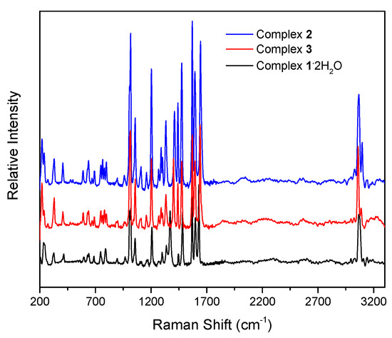 The Raman spectra of complexes 1∙2H2O (black), 2 (blue), and 3 (red).