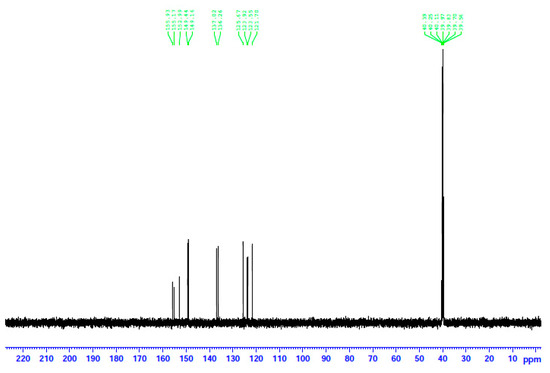 The decomposition of the complexes in DMSO is corroborated by the 13C NMR spectra. The spectra of the three complexes and the free dpkoxH compound are identical. This means that the coordinated dpkoxH is released in solution, i.e., the solution Cd(II) species do not contain the oxime ligand. Thus, the 13C NMR spectra of the decomposition products are identical to those of the “free”, i.e., uncoordinated, dpkoxH compound. The spectra exhibit the 11 signals expected for the carbon atoms of the organic molecule in the δ 121.7–155.9 ppm region [36,41,42,43,44]. The signal at δ 155.2 ppm is due to the carbon atom of the oxime group [36]; exact assignments of the pyridyl 13C resonances would be risky.