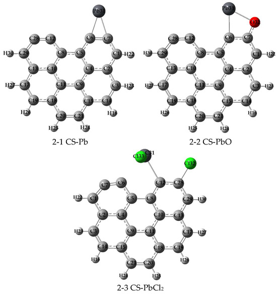 Figure 1 provides a visual representation of the adsorption configurations for Pb0, PbO, and PbCl2 on the pristine carbonaceous surface, denoted as structures 2-1, 2-2, and 2-3, respectively. Notably, our analysis revealed that the unsaturated carbon atoms at the edges of the carbonaceous material served as the active sites for adsorption in all cases. As shown in Table 1, the adsorption energies for these three configurations were found to be −310.35 kJ/mol for Pb0, −274.07 kJ/mol for PbO, and −260.96 kJ/mol for PbCl2. These negative values indicate a strong attractive interaction between the gases and the carbonaceous surface, signifying favorable adsorption. Furthermore, it is evident that the adsorption energy of structure 2-1 (Pb0) was the lowest among the three configurations, suggesting that Pb0 exhibited the highest affinity for adsorption on the carbonaceous surface compared to PbO and PbCl2. Notably, the optimized PbCl2 structure shows one Cl atom binding to a neighboring C atom rather than directly to Pb. This demonstrates the preferential interaction of one Cl atom with the carbon surface over the Pb. To gain deeper insights into the nature of the chemical bonds formed during the adsorption process, a Mayer bond order (MBO) analysis was employed, as listed in Table 1. The MBO analysis revealed that the bond order values were consistently close to 1.0 for all cases, indicating the formation of single bonds between the adsorbates and the carbonaceous surface.