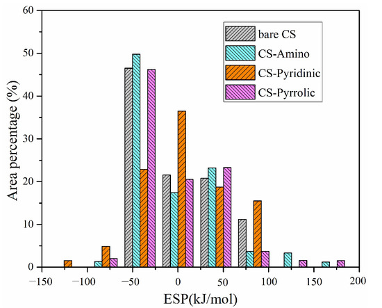 Therefore, ESP analyses on vdW surfaces for Pb0, PbO, and PbCl2 adsorption were further quantified to extract more information, and the corresponding percentages of different ESP values are presented in Figure 3. As seen from Figure 3, when examining the unmodified carbonaceous surfaces, the ESP distribution predominantly concentrates within the −50 kJ/mol to −100 kJ/mol interval. This range reflects the electrostatic characteristics of these pristine surfaces. However, upon the strategic incorporation of nitrogen functional groups onto the carbonaceous surfaces, a significant transformation in the electrostatic potential landscape is observed. Notably, the ESP distribution shifts towards higher absolute ESP values, indicating that the addition of nitrogen functional groups leads to an alteration in the electrostatic potential profile of the carbonaceous surfaces.