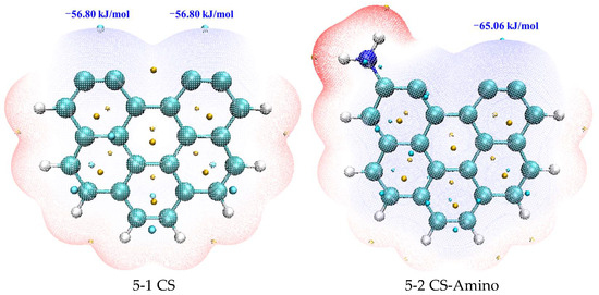 Additionally, the structural intricacies of a model denoted as structure 5-1 were closely examined, featuring a benzene ring with two unsaturated carbon atoms. The central region between these two unsaturated carbon atoms was identified as a critical point within the structure, characterized by a minimal ESP value of −56.80 kJ/mol. This unique feature allows for investigating how nitrogen functionalization alters the electrostatic landscape. Upon the strategic modification of the carbonaceous surface with nitrogen functional groups, pronounced alterations were observed in the electrostatic potential profiles of these active sites. Specifically, it was found that the ESP values at these active sites underwent changes, decreasing to −65.06 kJ/mol for the model incorporating amino functional groups (structure 5-2), −61.70 kJ/mol for the model with pyridinic functional groups (structure 5-3), and −66.87 kJ/mol for the model featuring pyrrolic functional groups (structure 5-4). These quantitative shifts demonstrate that nitrogen functionalization markedly modified the electrostatic characteristics of those sites.