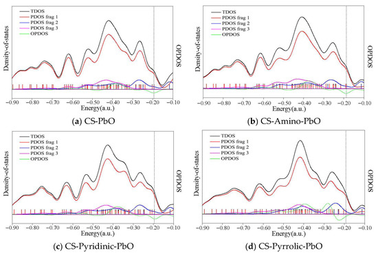 TDOS, PDOS, and OPDOS of PbO adsorption over bare and N-doped carbonaceous surfaces, frag.1 is C and N elements, frag.2 is PbO, and frag.3 is the H element of carbonaceous surfaces.