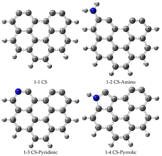 Currently, the quantum chemical method has been considered as the most accurate theoretical method for calculating molecular configuration and energy, of which density functional theory (DFT) has been widely employed due to its efficiency and accuracy [40,41]. In general, a simplified model that is reasonable can not only reduce the calculation workload, but also provide accurate results for complex systems. To simulate the structures of carbonaceous surfaces, armchair benzene rings were employed as the base models, which have been validated to reflect the properties of real carbonaceous materials [5,21]. Zou et al. demonstrated the feasibility of using armchair carbonaceous surface models by investigating the DFT calculations of arsenic adsorption [20]. Typical nitrogen functional groups were introduced onto the carbonaceous surfaces to examine the effects of the nitrogen modification of activated carbon on Pb adsorption. As illustrated in Figure 6, four types of carbonaceous surface models were constructed: (1) six armchair benzene rings (CS); (2) CS substituted with amino groups (CS-Amino); (3) CS substituted with pyridinic groups (CS-Pyridinic); and (4) CS substituted with pyrrolic groups (CS-Pyrrolic). This modeling approach allows for a systematic investigation of the mechanisms through which nitrogen functionalization enhances Pb adsorption capacity.