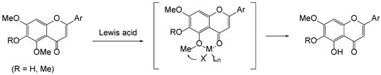We initially anticipated that the demethylation of 5-methoxyflavon could be controlled by the neighboring group participation of the 4-carbonyl group, as demonstrated in Figure 3. Indeed, 5-demethylflavones have been commonly produced employing Lewis acids such as AlCl3 [,], MgBr2.OEt2 [], and BCl3 []. Similarly, such demethylation was observed with a Brønsted acid []. We next postulate that demethylation takes place firstly at the 5-methoxy by the presence of the 4-carbonyl and then takes over the next nearest methoxy group (if, R = Me) by a newly formed 5-hydroxy group in both Brønsted and Lewis acids. It has been revealed that the 7-methoxy of 5,6,7-trimethoxyflavones is much harder to remove than the 5- and 6-methoxy groups [,].