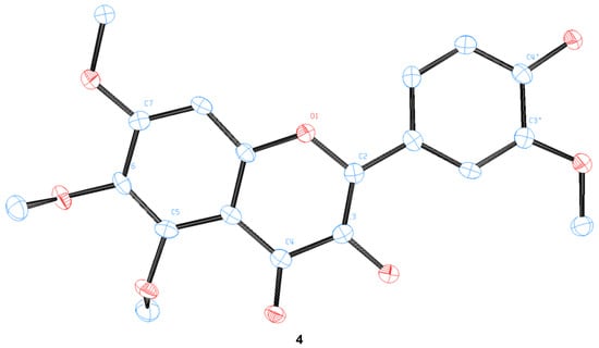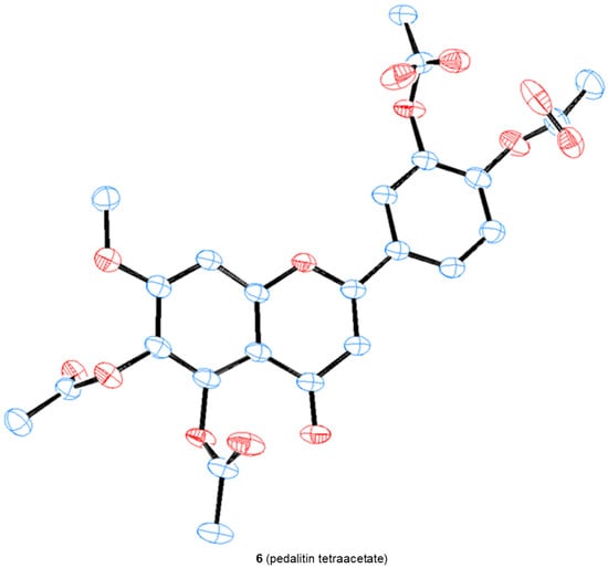 We were able to obtain two single crystals suitable for X-ray analysis and unambiguously determine the structure of 4 and pedalitin (as tetraacetate, 6), as depicted in Figure 4. 3-Hydroxylflavon 4 was purified by recrystallization, and its single crystal was grown by slow evaporation in the MeOH and EtOH mixture. To determine the structure, pedalitin was fully acetylated under the standard conditions to afford its tetraacetate 6, and then a single crystal was also similarly obtained by slow evaporation in EtOH. The structure of 4 was proven to be 3-hydroxyflavone showing two intramolecular hydrogen bonds between 3-OH and 4-C(O), and 3′-OMe and 4′-OH. The tetraacetate clearly shows the structure of pedalitin. However, the two carbonyl oxygens of 3′- and 4′-acetate of the tetraacetate show disorder. Interestingly, the dihedral angle of 3(C)-2(C)-1′(C)-2′(C) takes near-to-flat geometry as −11.6(6) for 4 and 166.9(18) for the tetraacetate compared to those of 2-phenylphenol [] and biphenyl [], respectively. It should be mentioned that there are many instances of a series of demethylations of polymethoxyflavones with widely contrasting outcomes [,,,].