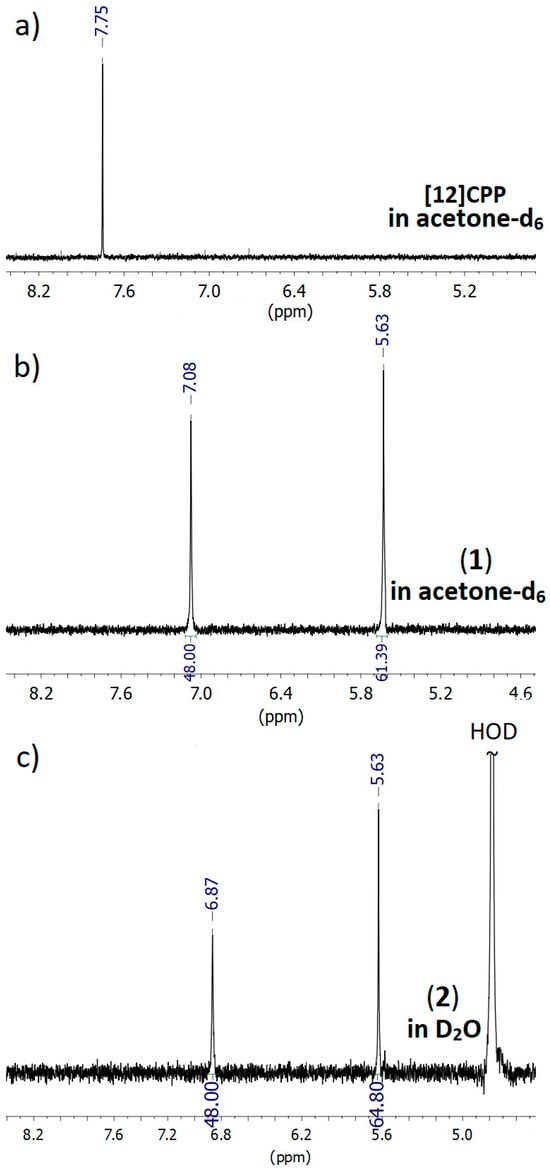 1H NMR spectra of [12]CPP in acetone-d6 (a), (1) in acetone-d6 (b), and (2) in D2O (c).