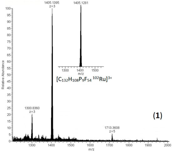 The positive mode of the high-resolution ESI mass spectrum of (1) showing a main cluster-peak at m/z = 1405.1395. Inset the calculated cluster-peak for the triple-charged cation [C132H108P9F54102Ru12]3+.