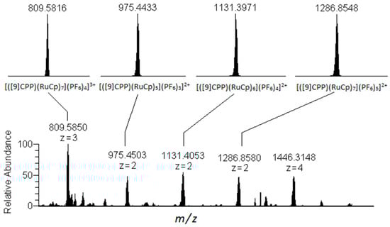 The positive mode of the high-resolution ESI mass spectrum of the reaction mixture, containing [9]CPP and an excess of [(η5–-Cp)Ru(CH3CN)3]PF6, shows the formation of various species of the complexes [(η6–-[9]CPP)[Ru(η5–-Cp)]n](PF6)n, with n ranging from 5 to 7.