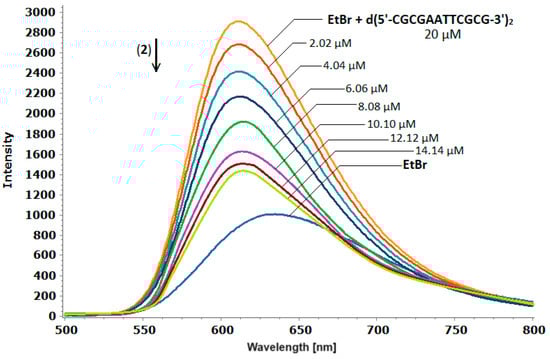 Fluorescence spectroscopy stands out as a highly sensitive and effective method for investigating the binding affinity of small molecules with DNA [41]. Ethidium bromide (EtBr) exhibits three different binding modes with DNA: (i) primarily through intercalation, which significantly enhances DNA fluorescence [42,43]; (ii) within the helix minor groove; and (iii) via electrostatic interactions due to its cationic nature [44]. The displacement of EtBr from DNA-EtBr adducts via a DNA binder results in a notable quenching in emission intensity. The degree of the quenching directly correlates with the competitive binding constant (Ksv). Molecular simulation studies investigating the interaction between the dodecamer d(5′-CGCGAATTCGCG-3′)2 and EtBr indicate its predominant stacking between the terminal base pairs CG of the sequence, with minimal interaction with the inner AT base pairs [45]. Investigating the affinity of (2) with the d(5′-CGCGAATTCGCG-3′)2-EtBr adducts, we prepared a solution d(5′-CGCGAATTCGCG-3′)2 in buffer phosphates (100 mM, pH = 7.0) to which we gradually added an amount of EtBr until the emission intensity reached the saturation point where any further addition has a negligible impact. Subsequently, a sample of the above stock solution was titrated with complex (2). It was observed that the emission intensity of the d(5′-CGCGAATTCGCG-3′)2-EtBr decreased rapidly as the concentration of (2) increased, while the λ of the emission maximum remained almost unchanged (Figure 5). This observation strongly suggests the displacement of the EtBr from the DNA-EtBr adduct due to its the interaction with (2). This outcome was unexpected, considering that (2) is capable of participating only in electrostatic interactions with the negatively charged phosphate groups of the d(5′-CGCGAATTCGCG-3′)2-EtBr.