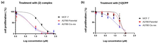To study the effects of (2) and [12]CPP on cell growth in vitro, three human cancer cell lines were treated with different concentrations of these compounds for 72 h and their IC50 values were calculated. The cytotoxic effects of the two compounds were monitored by employing real-time imaging using the Incucyte ZOOM system and the results are shown in Figure 6. Complex (2) exhibited the most potent effect on the proliferation of the ovarian cancer cell line A2780 and its cisplatin-resistant counterpart (A2780 Cis-res) (Figure 6a) depicting similar IC50 values (4.85 and 4.76 μΜ, respectively) (Table 1). It is interesting that both cell lines were equally sensitive to complex (2), suggesting that this compound has the potential to be used as a second-line treatment after the development of cisplatin resistance in ovarian cancer. Complex (2) showed a weaker, but still potent, cytotoxic effect on the breast adenocarcinoma cell line MCF-7 (Figure 6a) with the IC50 value being 16 μM (Table 1). The A2780 Cis-res cells were quite susceptible to the cytotoxic effect of the [12]CPP compared to the other two cell lines (Figure 6b). Specifically, the IC50 value of [12]CPP in the resistant cells was ~10 μM, while it was ~17.5 μΜ and ~19.5 μΜ in the A2780 parental and in the MCF-7 cells, respectively (Table 1). Overall, complex (2) was more efficient than the [12]CPP one, especially in the ovarian cancer cells.