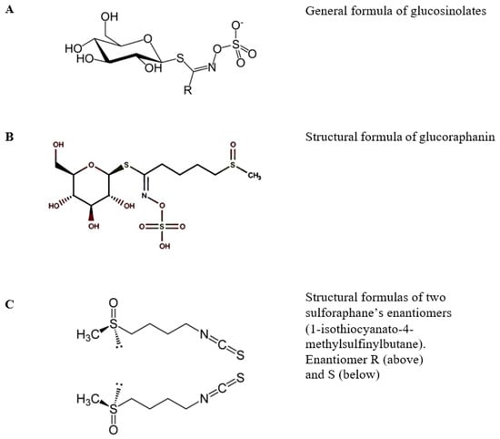 14]. The precursors of active isothiocyanates are glucosinolates, a group of organic compounds that are a type of thioglycoside. The number of currently known substances classified in this group exceeds 120. They have a similar structure that includes a β-D-thioglucose molecule, a sulfone oxime group, and a side chain derived from one of seven amino acids (